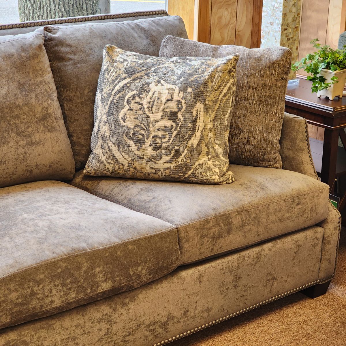 Item Description Santiago is sleek and comfortable. The crisp lines are accented with hand applied brass nails. The plush cushions are supported by our signature 8-Way hand-tied spring foundation.
