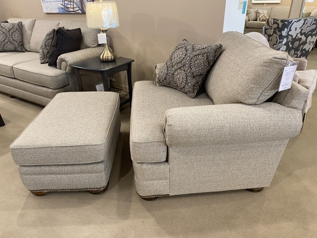 Item Description England's Knox collection is anything but ordinary, with its transitional styling it stands out in any room. This chair and a half has a roll arm, bun foot, T-cushion, and optional antique brass nail head trim on the arms and base and comes with a matching ottoman.