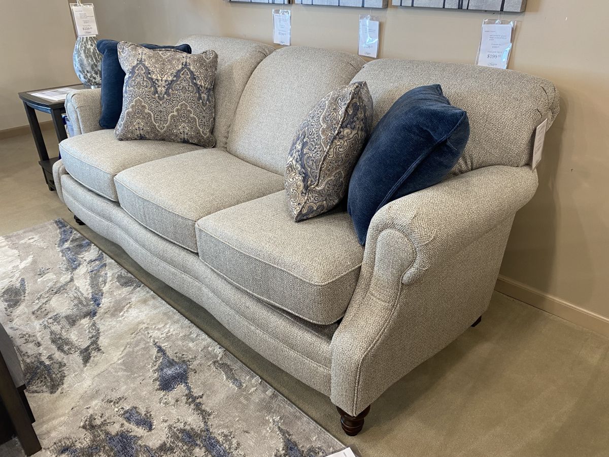 Item Description The Drayton collection is sure to turn some heads. The 7D05 crafted in Capella Dune fabric is a perfectly scaled traditionally styled sofa featuring a rolled arm, tight scroll back, and turned leg.