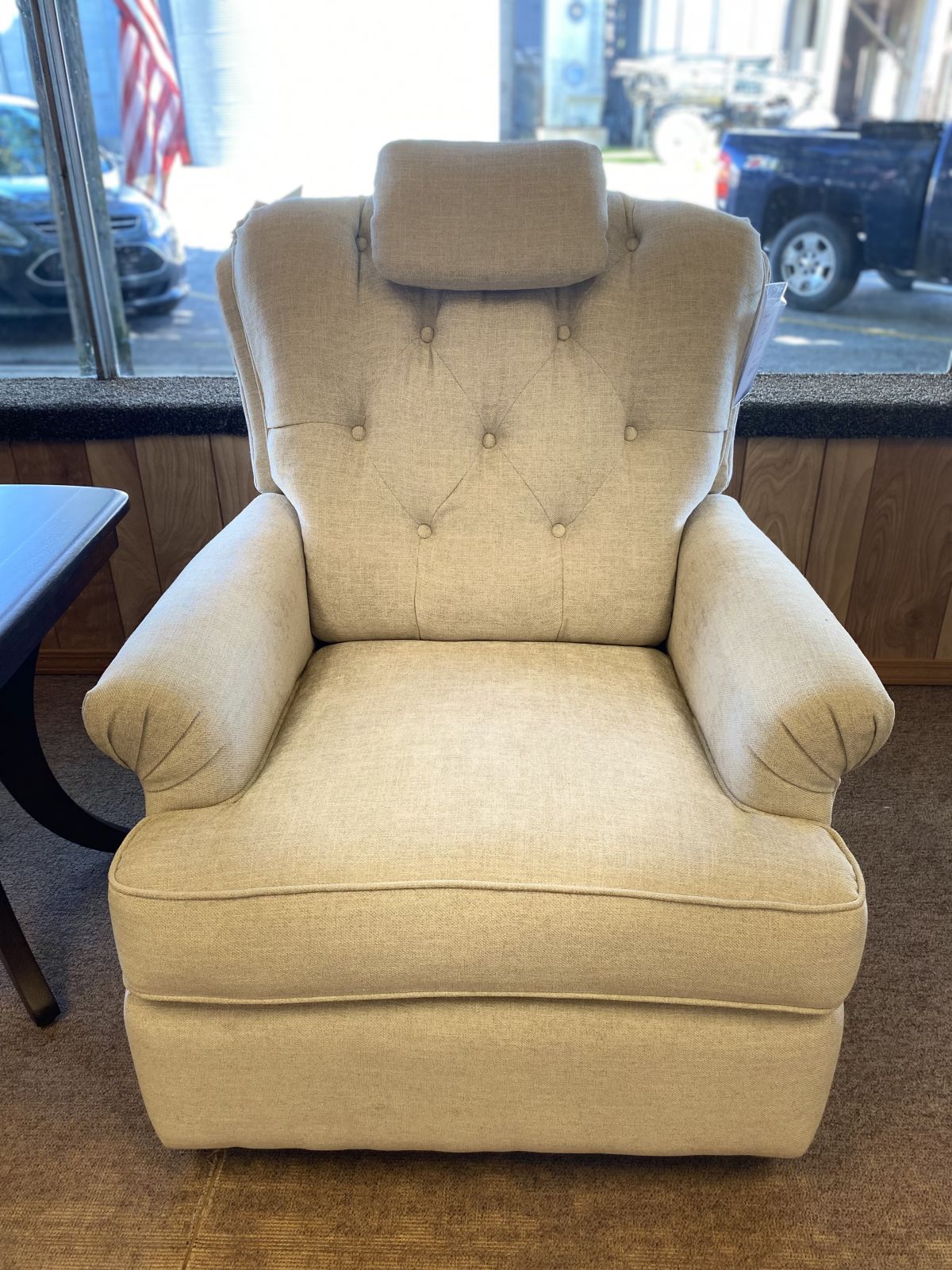 Item Description Power recliner with winged back, shaped button tufted back cushion, pleated rolled arms, welted boxed t-seat cushion with pocketed coil springs and down blend topper, and plushily padded footrest. Outside arm push button controller with USB ports for A and C types.
