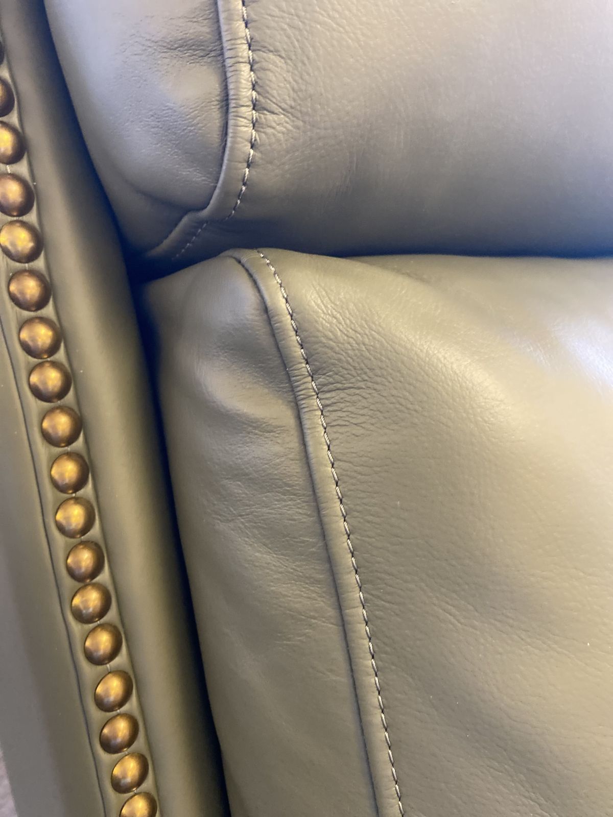 Item Description Triple power low leg recliner with power recline, power headrest and power lumbar. 44.9” high pub back design, loose welted box seat cushion with pocketed coil springs encased in foam, wrapped in Dacron with a feather blend topper, footrest extension, nail head trim accents, and tapered wood legs finished in a warm mahogany finish. This chair was designed for people over 6’