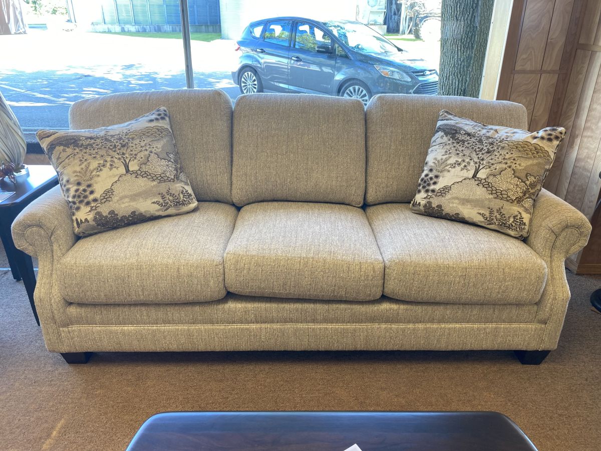 Item Description The Jordan Sofa by King Hickory was designed for comfort. The crisp lines and the plush cushions are supported by our signature 8-Way hand-tied spring foundation. Strong double-needle stitching is used in lieu of welt. Contrast pillows in Yuhua Linen Fabric.