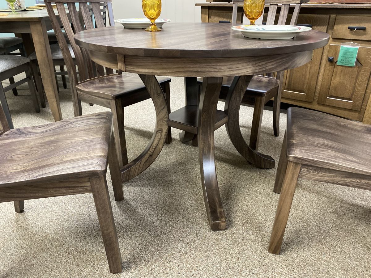 Item Description Built to last by Amish crafters. Round pedestal table comes with four side chairs.
