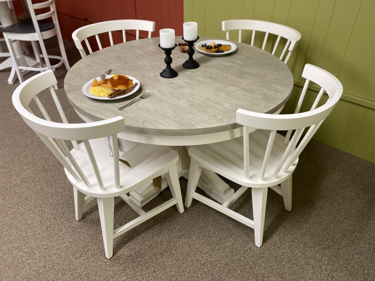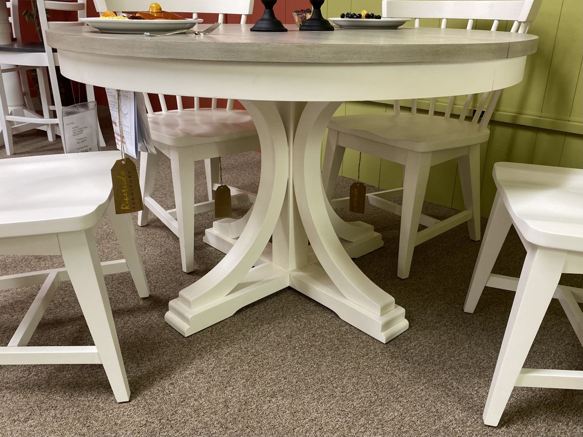 Item Description Constructed of select hardwoods and crafted to be the focal point of your dining room. Soft grey top accents the beautiful white case. Graceful arched pedestal with grand scaled base makes this a must see dining set. Four curved back chairs for comfort dining.