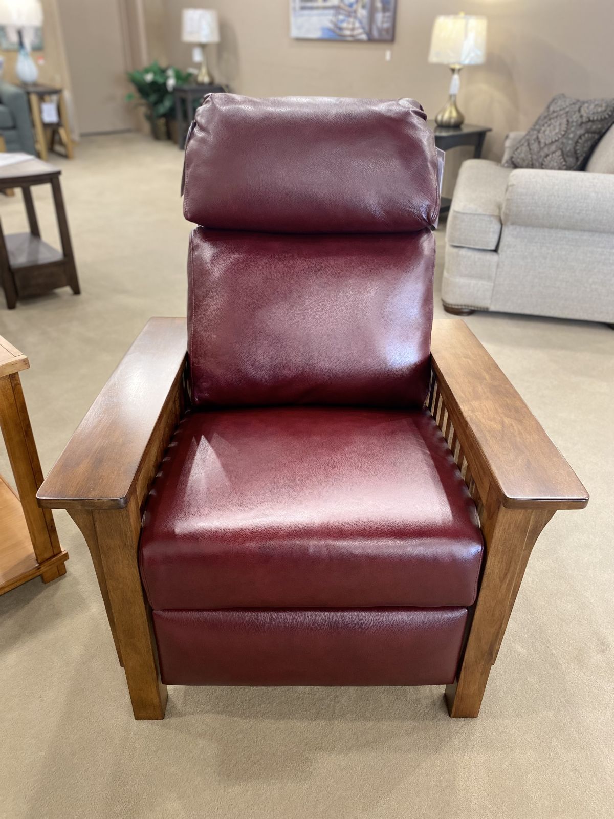 Item Description Characteristic of the Arts and Crafts period, this Mission 3 way low leg recliner offers classic craftsman styling and boast luxurious comfort with zippered semi attached back pillows, tight bullnose seat with pocketed coil springs encased in foam and wrapped in Dacron. Footrest extension for extra leg support. Wood arms are finished in a warm mahogany finish.