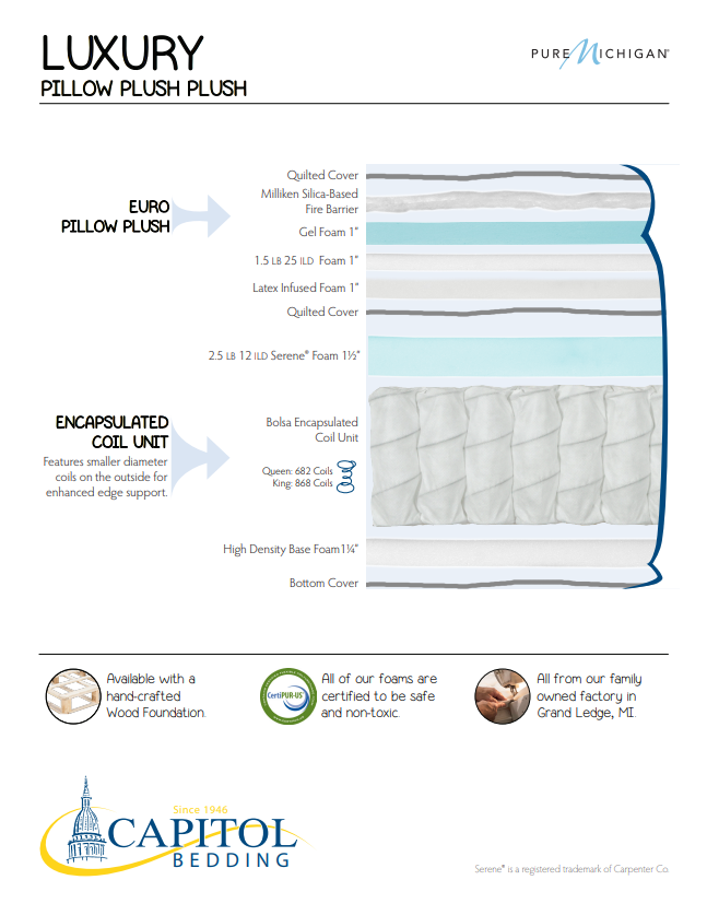 Item Description Mapes Furniture carries mattresses that represent the very best of what Capitol Bedding hand-crafts every day. The highest quality components combine with exquisite details found in few other mattresses to give you the most restful nights sleep for many many years to come. Custom order in your size and comfort choices. Mapes Furniture and Capitol Bedding are a dreamy combination.