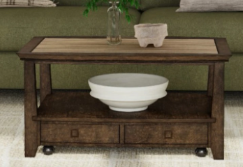 Item Description This Rectangular Cocktail Table features updated, elegant transitional styling combining a beautiful brown and gray multi-toned laminate top and a Sable wood finish. It has an antique brass hardware that accentuates this piece and makes it a uniquely beautiful marketable design.