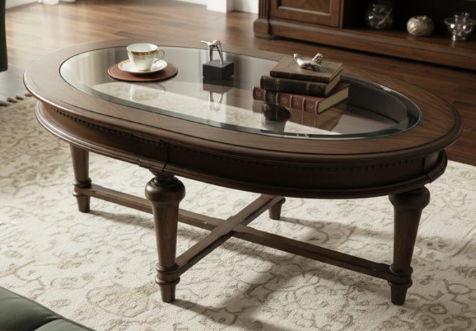Item Description Mindi veneers and select solids with a beveled glass top, tapered legs with turned tops and a Java finish make this coffee table a classic.