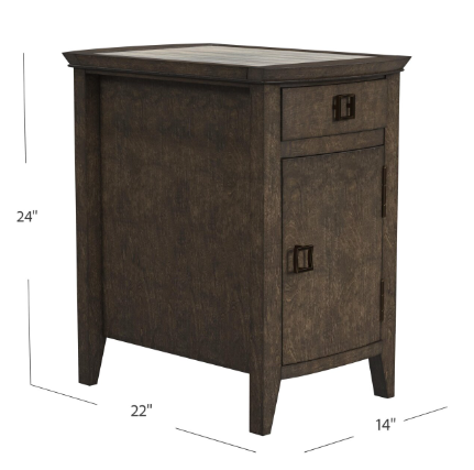 Item Description Revamp your living space with the Woodmill Collection's Two-tone Wood Chairside Cabinet, a versatile piece blending rustic charm with modern convenience. Crafted from sturdy poplar solids and adorned with birch veneers, this cabinet boasts a captivating two-tone finish, marrying warm brown hues with subtle gray undertones. With a drawer, spacious cabinet, and magazine storage at the back, it offers ample space to keep your essentials organized. Plus, the added charging port at the back ensures your devices stay powered up and ready to go. Elevate your home decor with this functional yet stylish addition, complete with aged antique brass hardware for a touch of vintage flair.